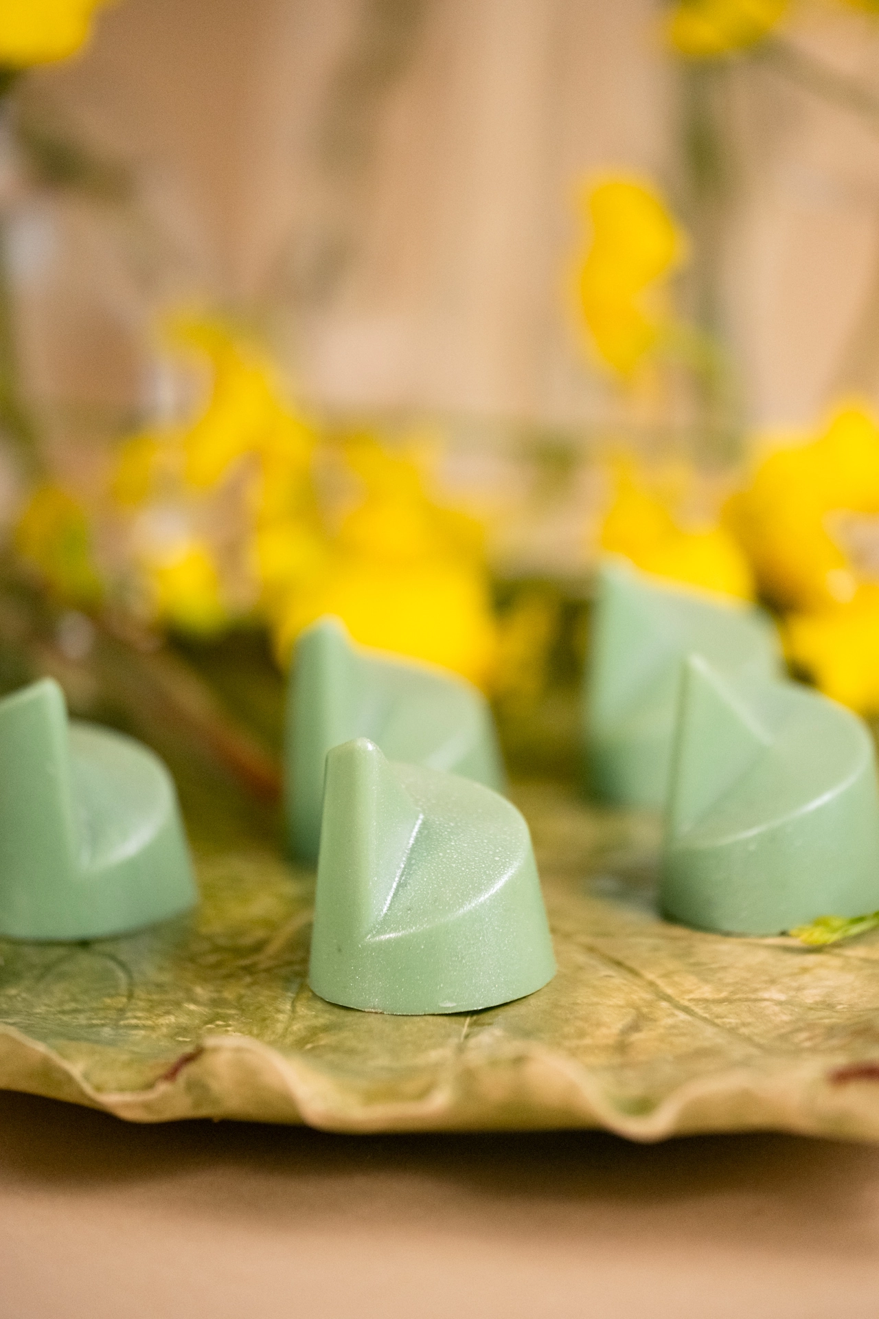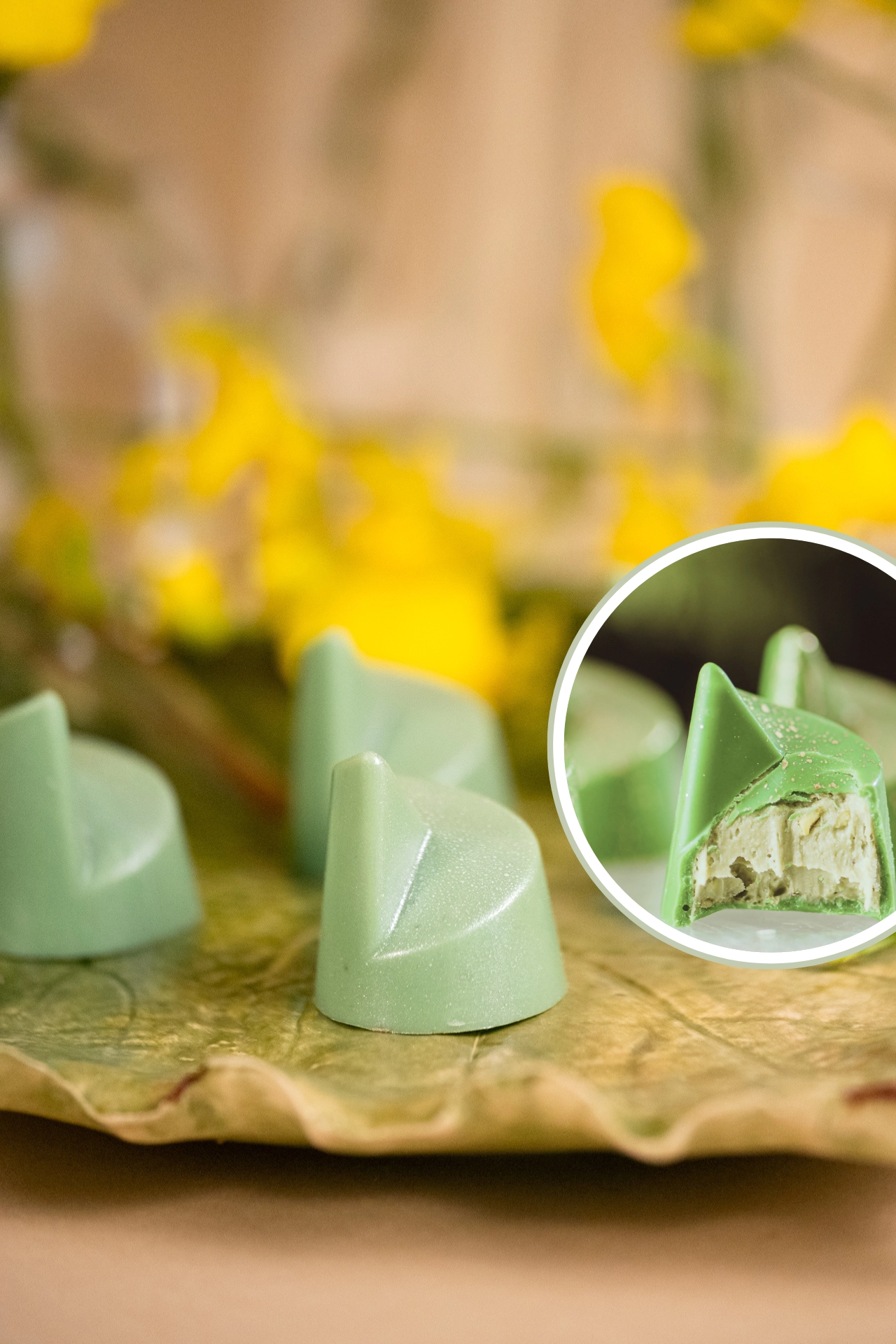 Aspiral de chocolate belga branco na cor verde com recheio de pistache