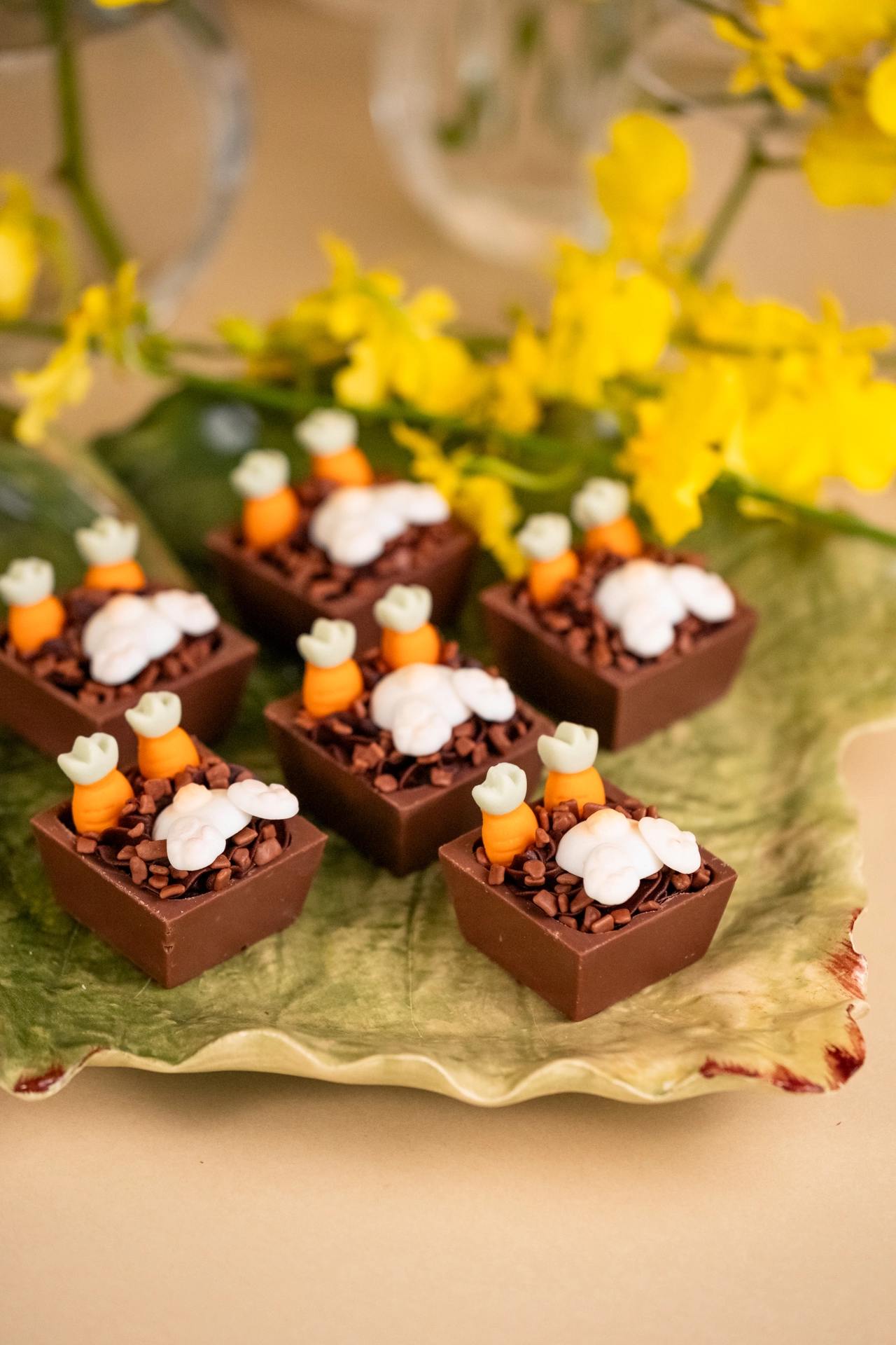 Caixinha de chocolate ao leite belga com creme suíço e decoração de açúcar