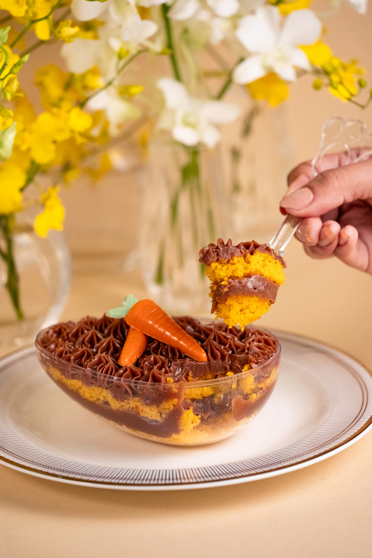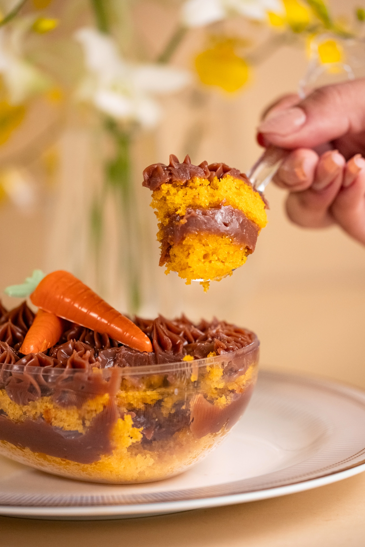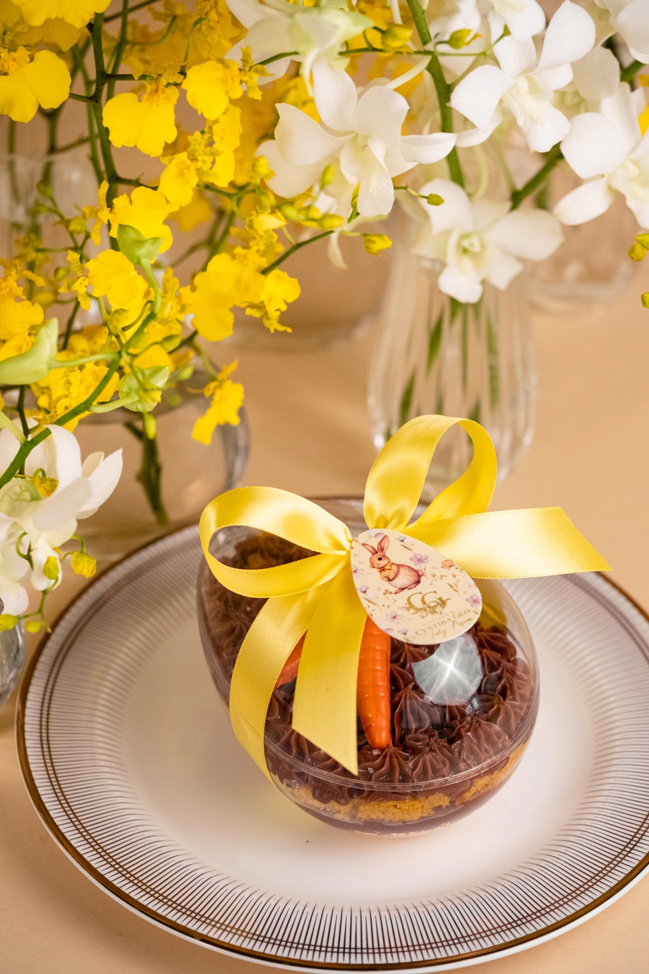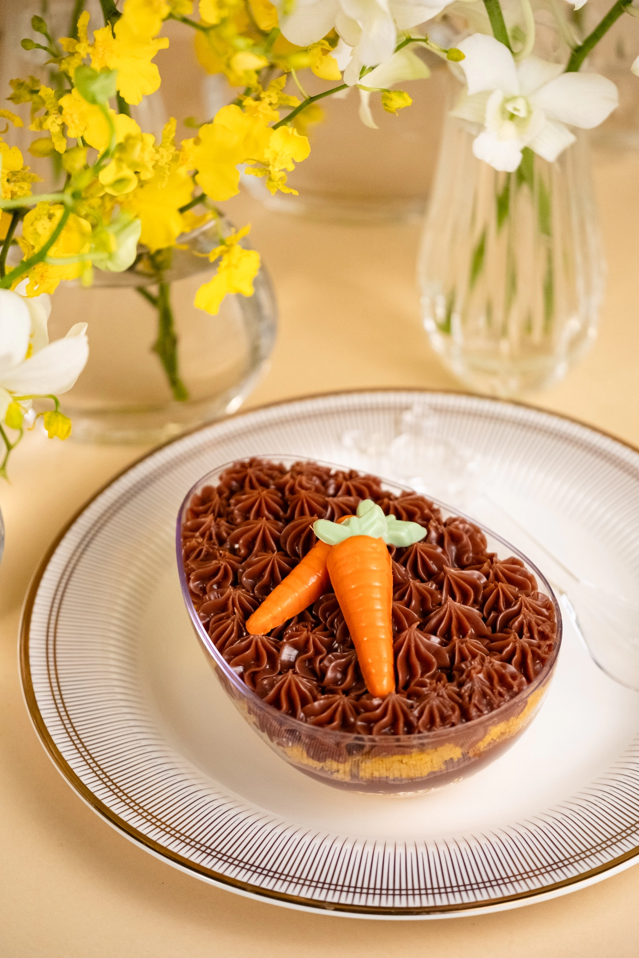 Ovo de acrílico com bolo de cenoura e brigadeiro em camadas.